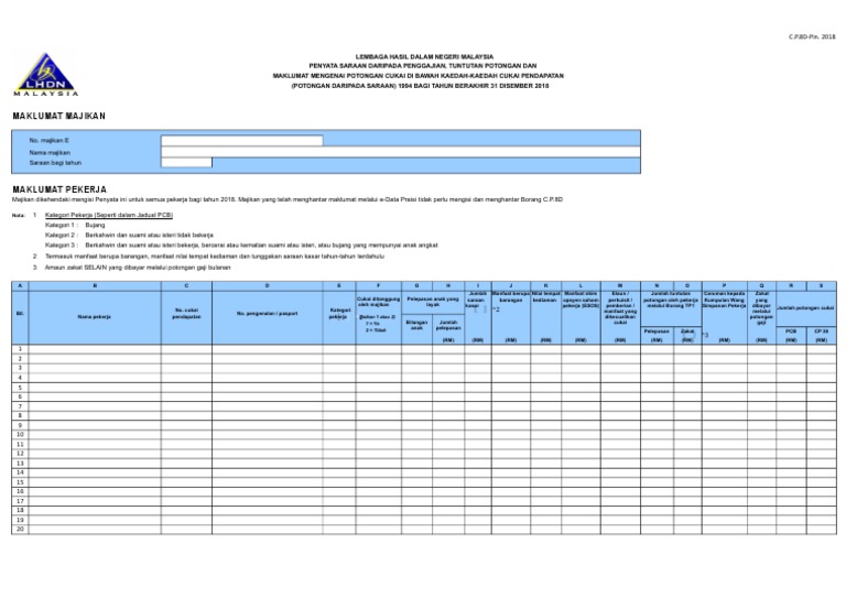 Hak Cipta Terpelihara 2018 Lembaga Hasil Dalam Negeri Malaysia Hak Cipta Terpelihara 2018 Lembaga Hasil Dalam Negeri Malaysia. Details for ALL employees remuneration matters to be included in the CP8D 2019 CP8D has 18 columns to be filled up per employee basis which requires extensive information and the coverage of all ranges of remuneration ie. Etc Who Needs To File Form E.